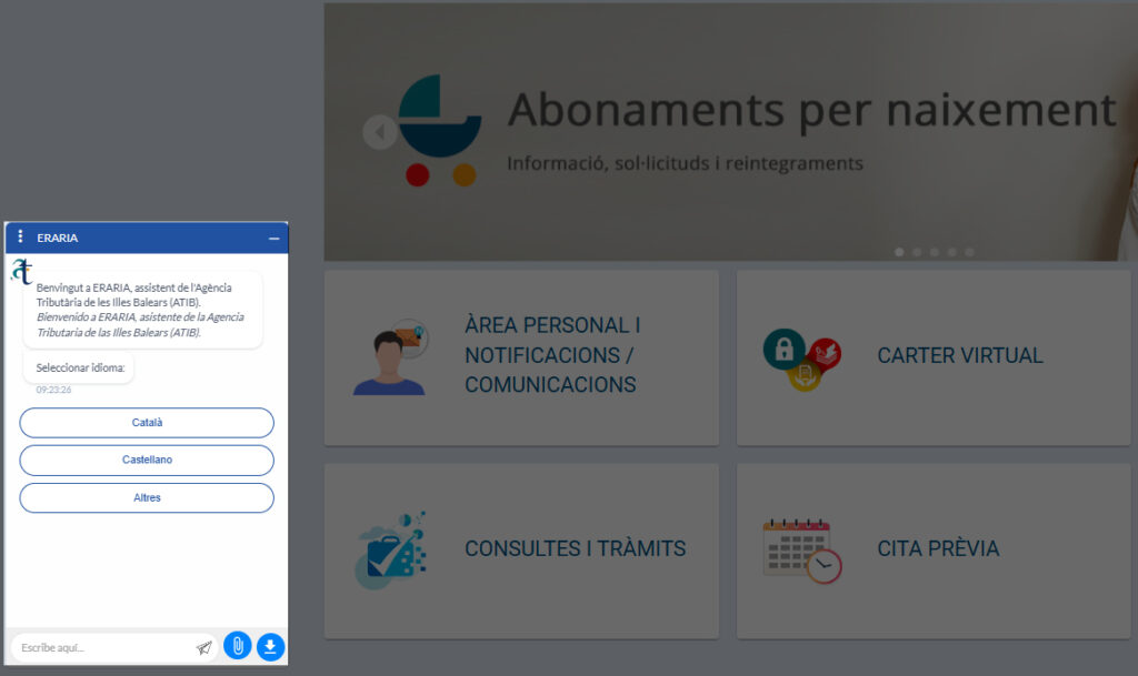 Esta asistente, bautizada como ERARIA, permite realizar tanto consultas como gestiones a través del portal de la ATIB. Desarrollada con inteligencia artificial (IA), la asistente trabaja con lenguaje natural y menús estructurados, de manera que los usuarios disponen de ambos métodos para interactuar con la ATIB.